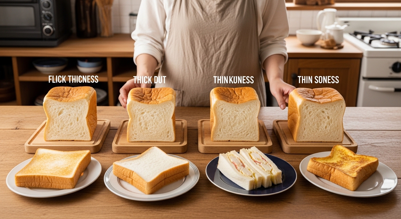 A8. 一般的には4枚切り約3cm、5枚切り約2.5cm、6枚切り約2cm、8枚切り約1.5cmを目安にするとショップと近い厚さになります。
